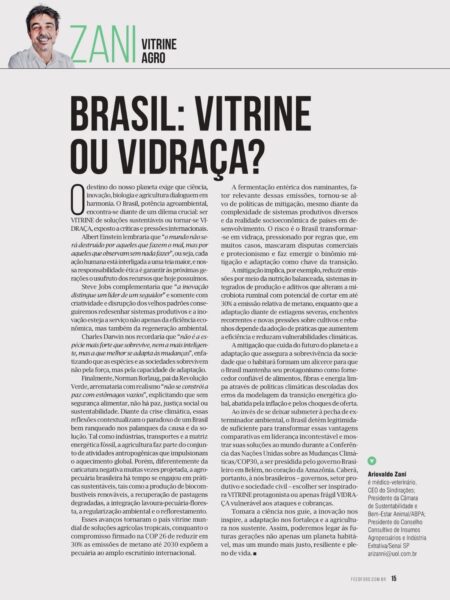Ao invés de se deixar submeter à pecha de exterminador ambiental, o Brasil detém legitimidade suficiente para transformar essas vantagens comparativas em liderança incontestável e mostrar suas soluções ao mundo durante a Conferência das Nações Unidas sobre as Mudanças Climáticas/COP30, a ser presidida pelo governo Brasileiro em Belém, no coração da Amazônia. Caberá, portanto, à nós brasileiros – governos, setor produtivo e sociedade civil – escolher ser inspiradora VITRINE protagonista ou apenas frágil VIDRAÇA vulnerável aos ataques e cobranças.